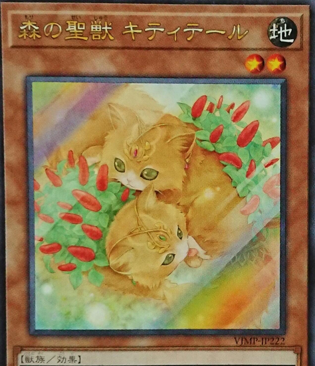 森の聖獣 キティテール 星2 地属性獣族 ATK/200 DEF/200このカード名の①②の効果はそれぞれ1ターンに1度しか使用できない。①:このカードが召喚・特殊召喚に成功した場合、自分の墓地の獣族・獣戦士族・鳥獣族・昆虫族・植物族モンスター1体を対象として発動できる。そのモンスターと元々の種族が同じとなるモンスター1体をデッキから墓地へ送る。②:このカードが相手によって破壊された場合に発動できる。デッキから「森の聖獣 キティテール」以外の獣族・獣戦士族・鳥獣族・昆虫族・植物族モンスター1体を手札に加える。