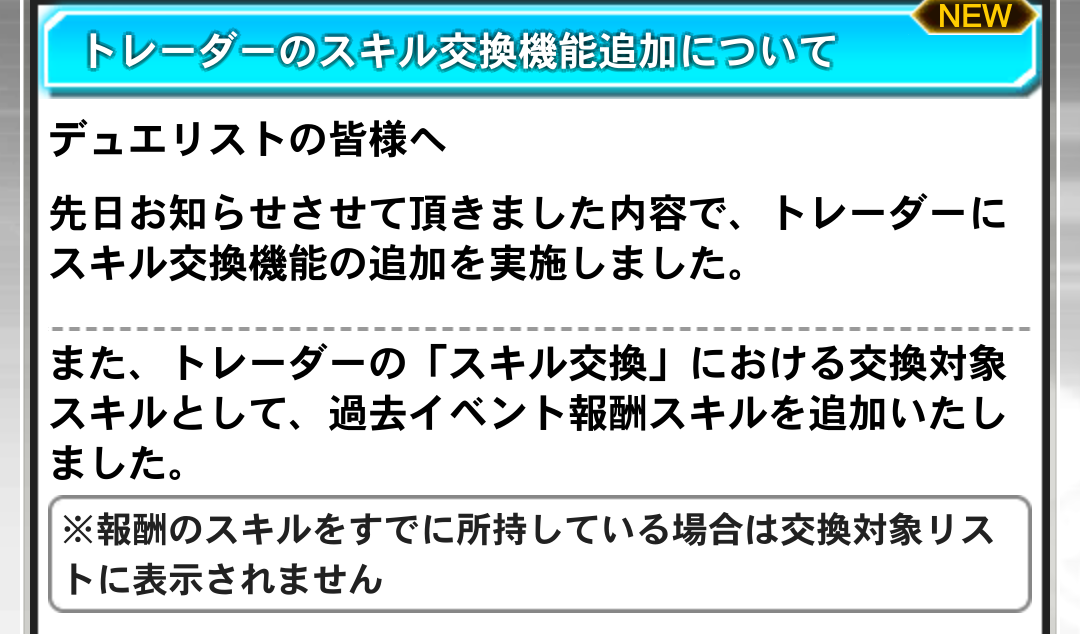 トレーダーの「スキル交換」における交換対象スキルとして、過去イベント報酬スキルも追加!