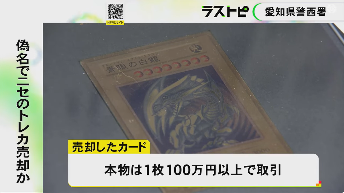 署によると、販売したカードはそれぞれ100万円以上の高値で取引されるポケモンのキャラクター「リーリエ」と遊戯王の「青眼の白龍」。古物業者が7月、「偽物と判明した」と署に相談した。
