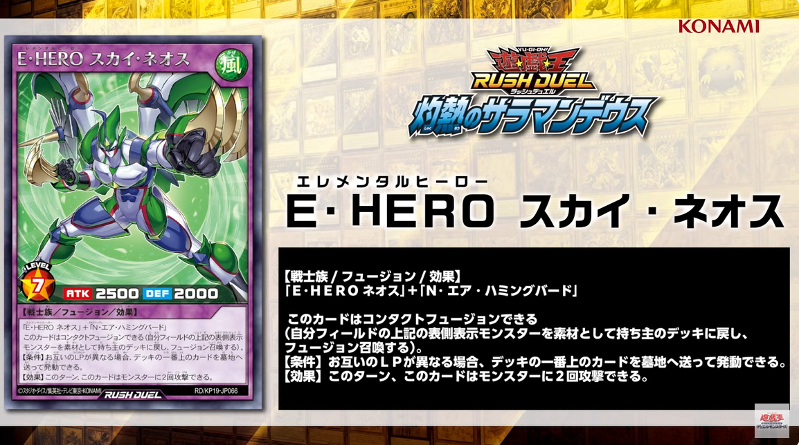 - ヒーロー・ディセントのテキストが長くなるけど、名称指定じやなくて『「E・HEROネオス」を素材に指定するフュージョンモンスターに素材としてカード名が記されたモンスター(「E・HEROネオス」以外)』にすれば他のネオスペーシアンも対象になってたのに……