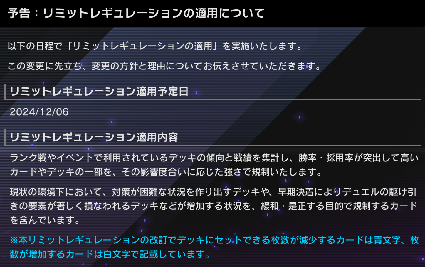 12月6日に「リミットレギュレーションの適用」を実施いたします。