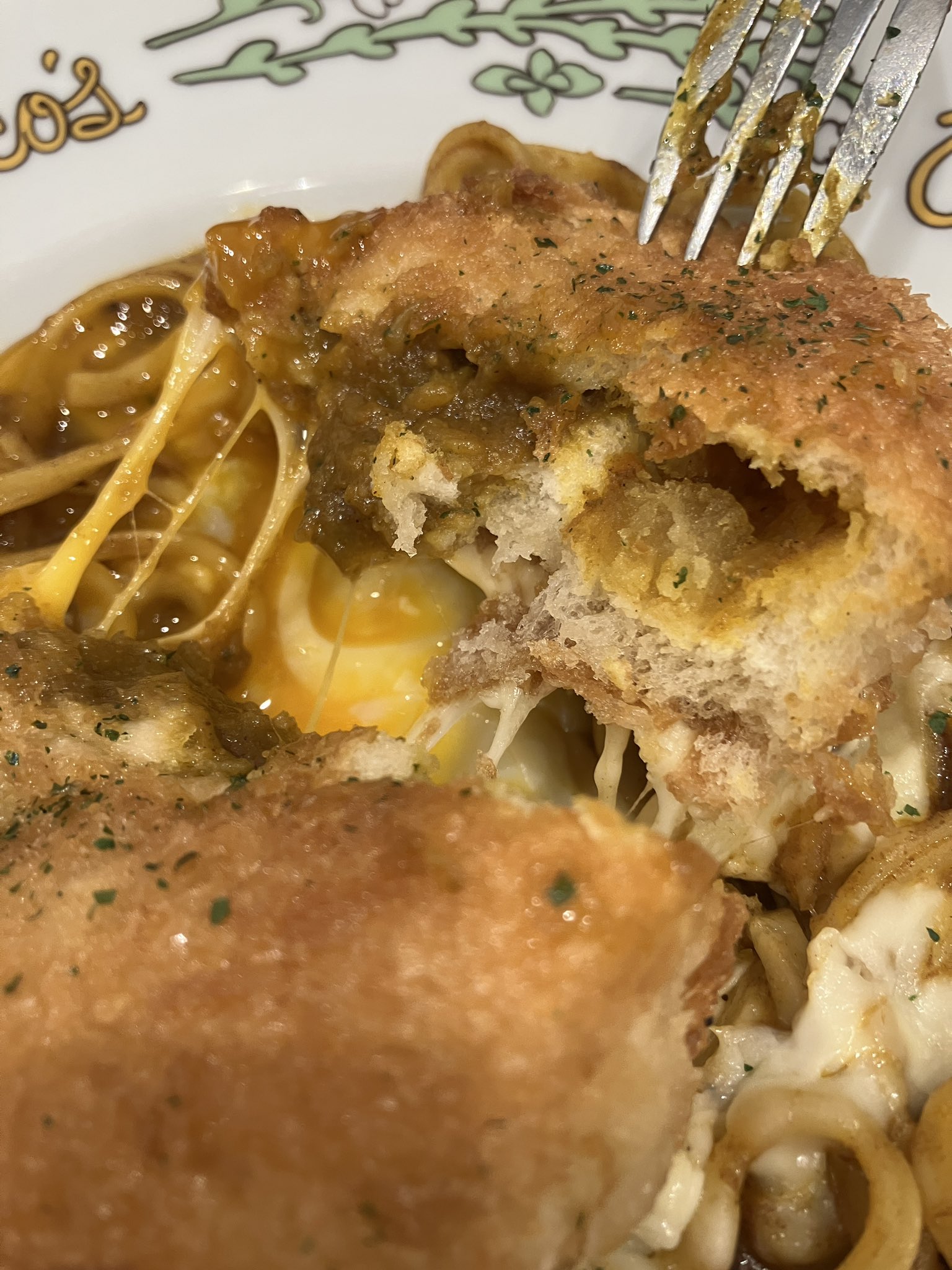 カレーパスタにカレーパン乗っけたやっつけ料理かと思ったらカレーパンの下にチーズと半熟玉子が乗っかっててダメだった…