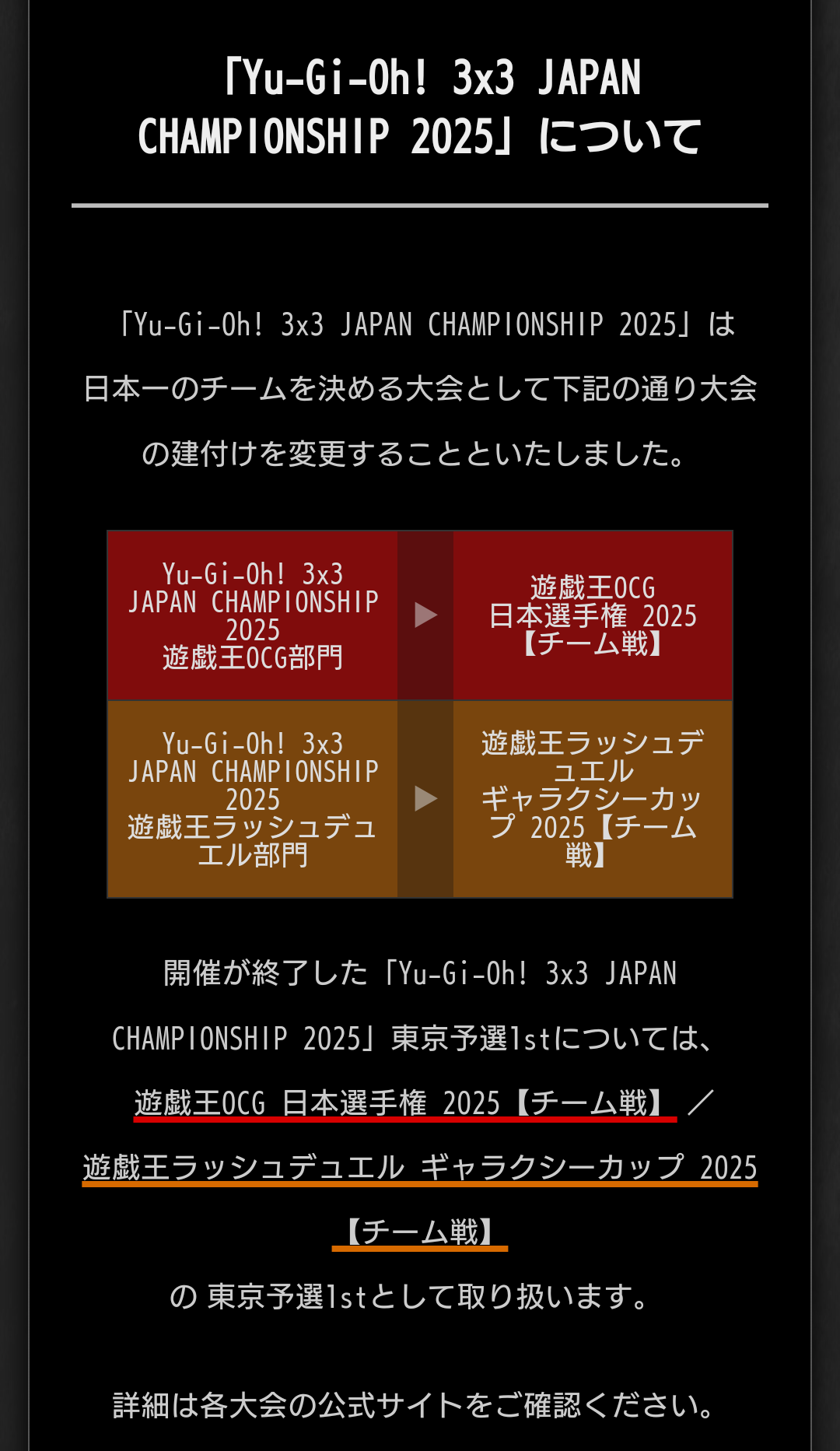 「Yu-Gi-Oh! 3x3 JAPAN CHAMPIONSHIP 2025」は日本一のチームを決める大会として下記の通り大会の建付けを変更することといたしました。