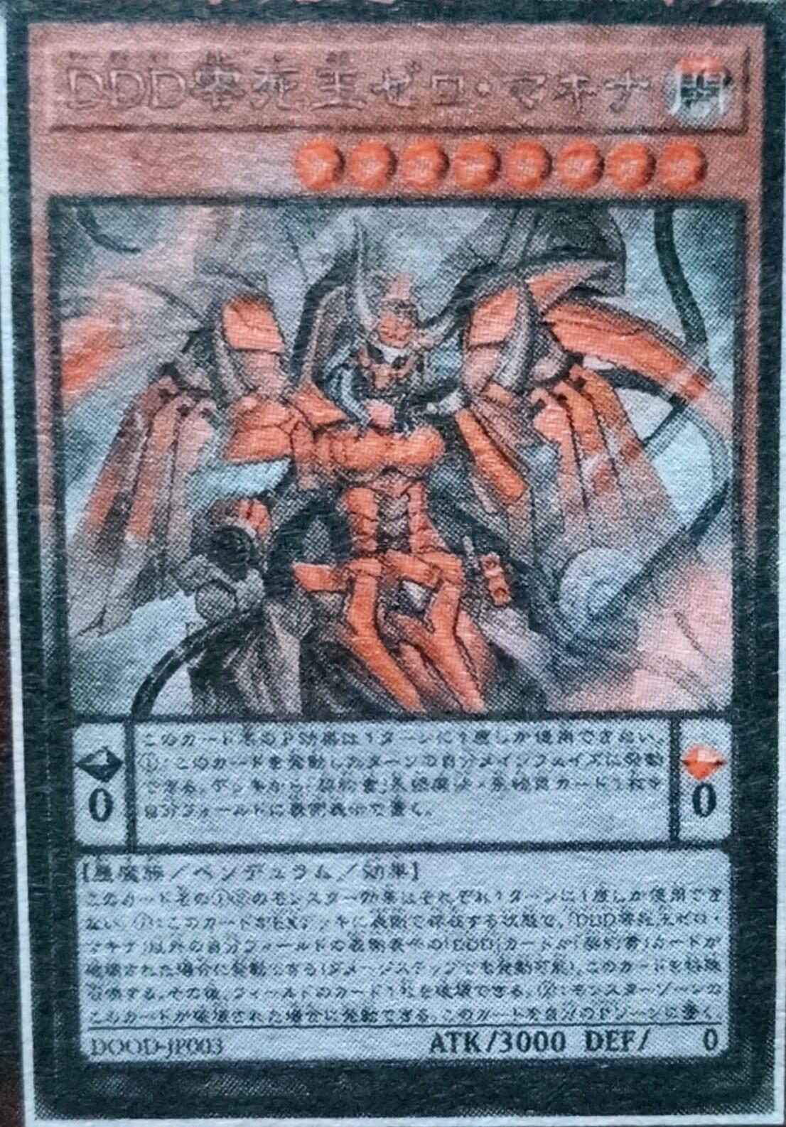 ①:このカードがEXデッキに表側で存在する状態で、「DDD零死王ゼロ・マキナ」以外の自分フィールドの表側表示の「DDD」カードか「契約書」カードが破壊された場合に発動できる(ダメージステップでも発動可能)。このカードを特殊召喚する。その後、フィールドのカード1枚を破壊できる。