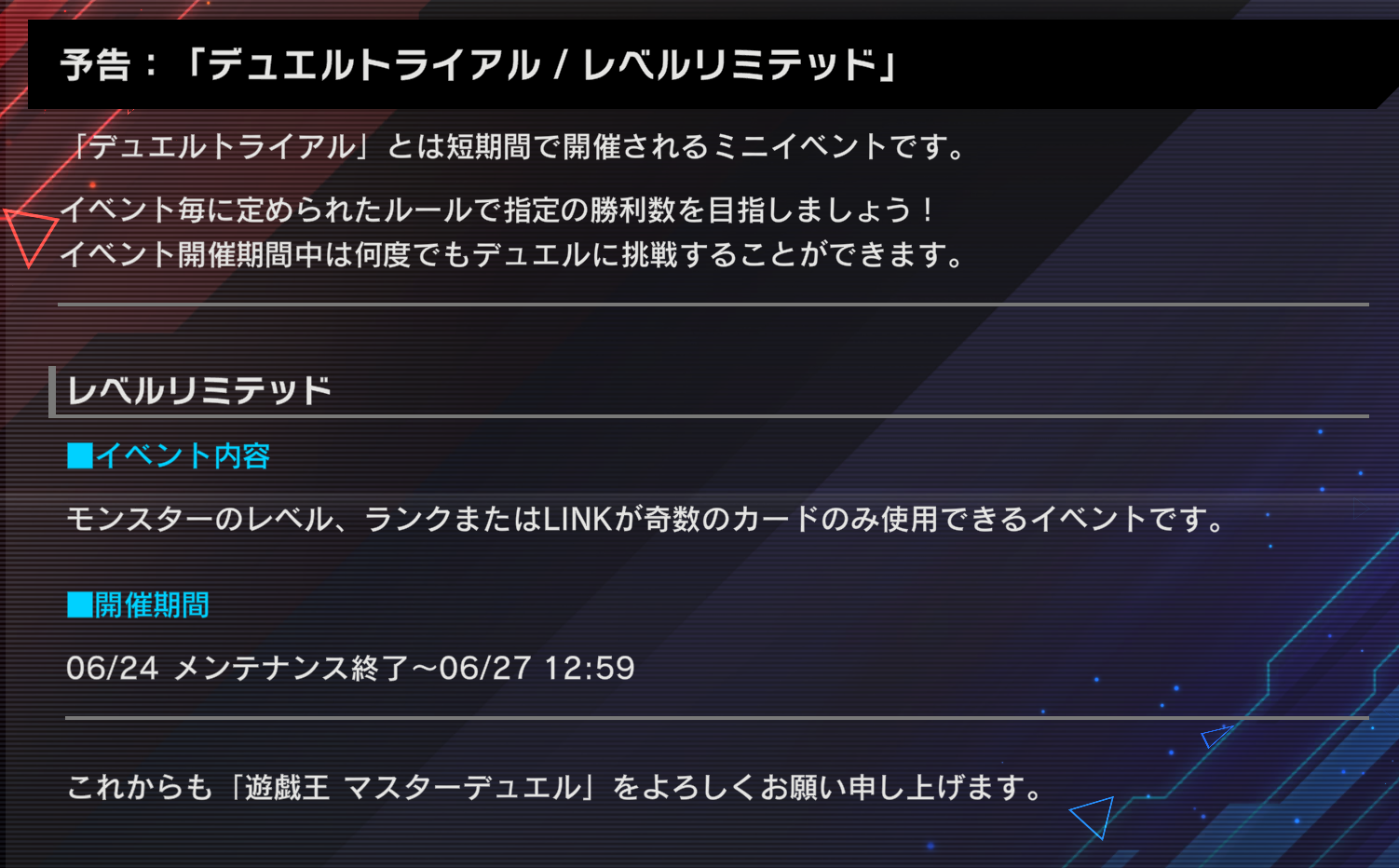 モンスターのレベル、ランクまたはLINKが奇数のカードのみ使用できるイベントです!#遊戯王マスターデュエル pic.twitter.com/zapRBrLQmm
