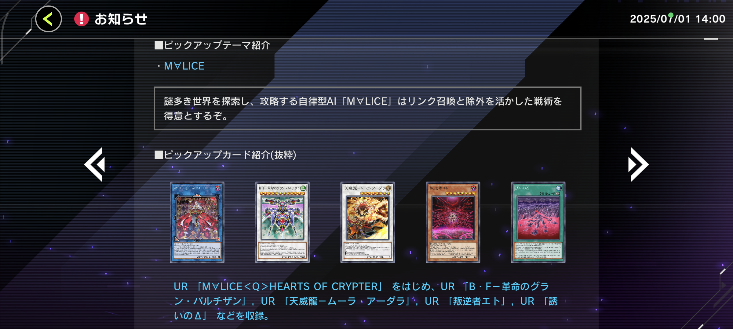 ホワイトラビットUR、チェシャキャットUR、ドーマウスSR、アンダーグラウンドUR、レッドランサムUR、ホワイトバインダーUR、ハーツオブクリプターUR