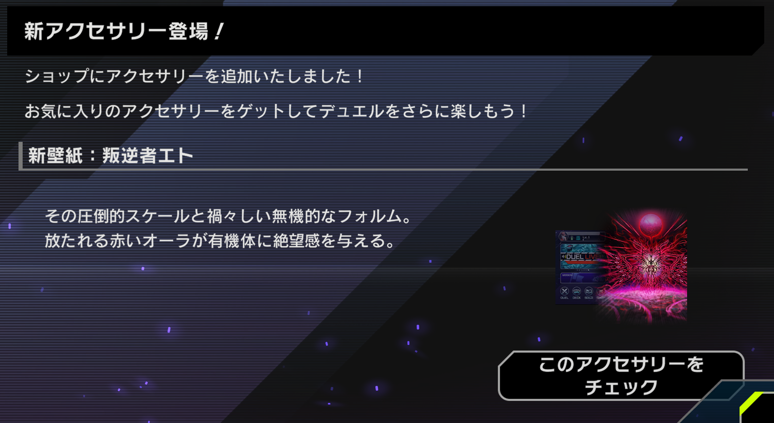 【新アクセサリー登場】・壁紙:叛逆者エト#遊戯王マスターデュエル pic.twitter.com/Dlw4u6atKL— 【公式】 遊戯王 マスターデュエル (@YuGiOh_MD_INFO) July 4, 2025