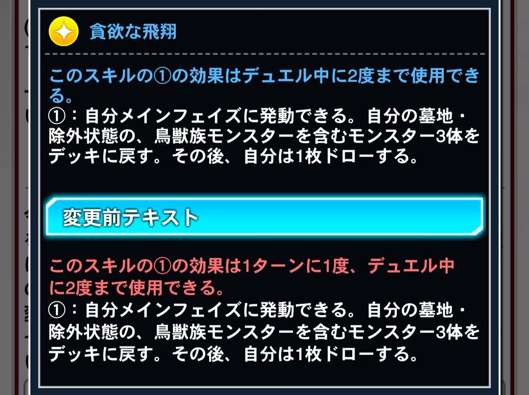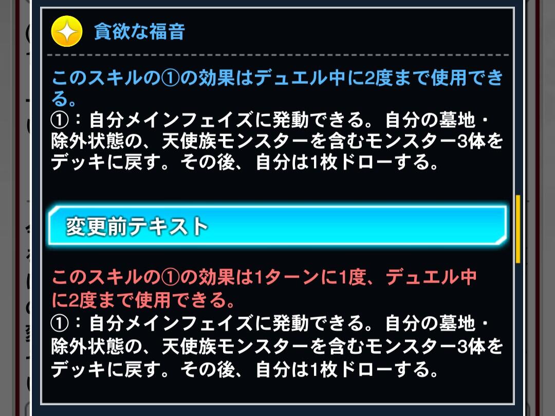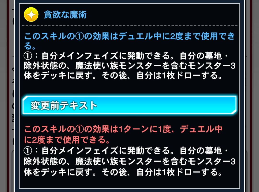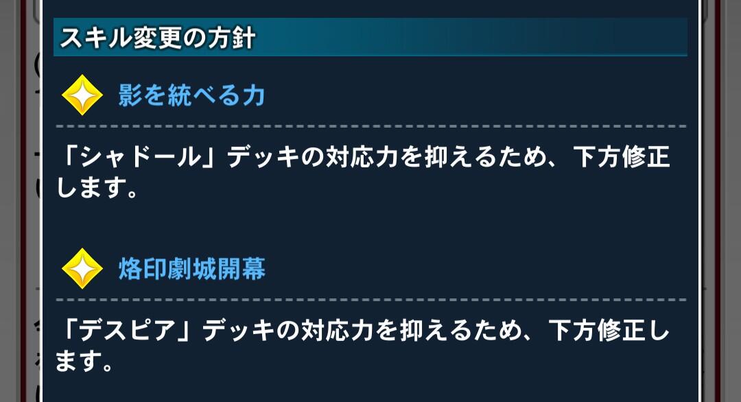 - ユーザー数の減少率がマスター配信直後の次くらいに酷かったからなのか今回はスキルだけ弱体化してカードは規制しない方針にしたんだろうなって思いたくなるくらい環境デッキへの規制が甘い