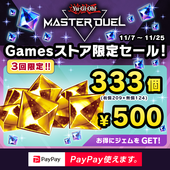お1人様3回限り!「ジェムパック 333」メニューが期間限定で出現!「遊戯王 マスターデュエル」Gamesストアで333ジェム(有償209+無償124)が¥500で3回まで購入できるお得なセールを期間限定で実施中!ジェムをお得にGETできるチャンスをお見逃しなく!