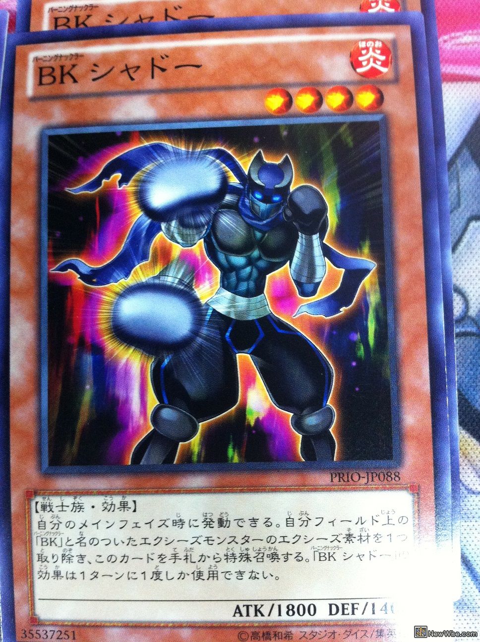 BK シャドー 星4 炎属性戦士族 ATK/1800 DEF/1400自分のメインフェイズ時に発動できる。自分フィールド上の「BK」と名のついたエクシーズモンスターのエクシーズ素材を1つ取り除き、このカードを手札から特殊召喚する。「BK シャドー」の効果は1ターンに1度しか使用できない。